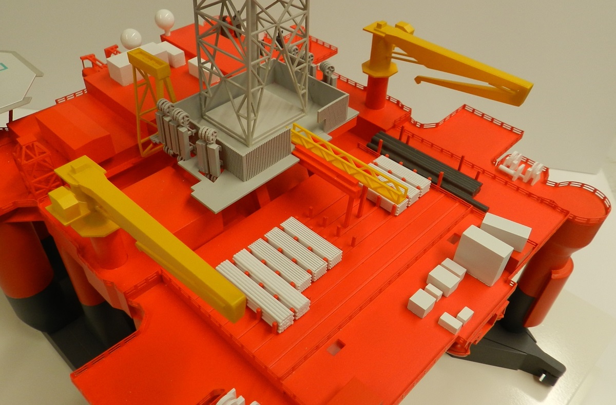 Drilling Rig Models – 1:400 ScaleThree presentation models for drilling rig manufacturer. At 1:400 scale these drilling rig models were only just over 200mm wide so were extremely small and fiddly to make. For example the handrails you can see in the close-up photos were less than 3mm tall. Because of the small scale the client said the models could be slightly simplified, which they are, but as you can see from the pics we still managed to show a high level of fine detail. When completed the three models were shipped to the client in Aberdeen, after which they were shipped on to their own clients as gifts.