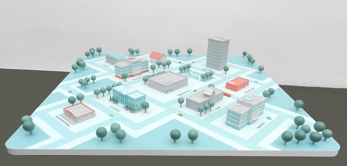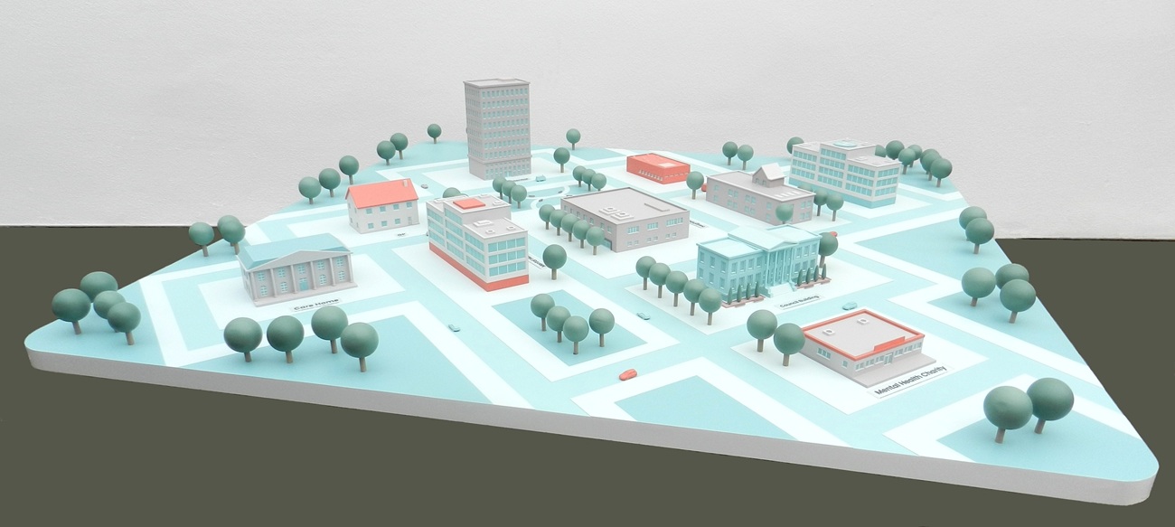 The brief for this project was to produce a physical model based on a CGI image of a stylized townscape which featured on the client’s website. This meant we had to create our own CAD from scratch for each of the building types based just on 2D screengrabs . We then produced the physical models using our laser cutters and conventional architectural model making techniques before finishing them in colours to match the on-screen images. We also had to incorporate addressable LEDs so the client could create flashing illuminated routes along the roads in varying colours and internal illumination of the buildings. Addressable LEDs can be controlled from your PC or even from an Ap you can download on your phone.