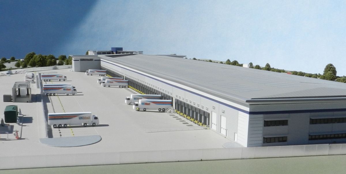 UK Mail ordered two identical site models of their huge new facility at Ryton because they needed an overview model at either end of the site, one in the offices and one in the main warehouse building. Constructing two models at the same time enabled us to offer them a significant saving on the second unit. This model was actually at 1:400 scale which is a good option for a site model because it keeps the base size down but still allows us to show a recognisable level of detail. We were even able to show a good representation of the parcel handling conveyors through the cut-away roof (click on the pic to see the detail).